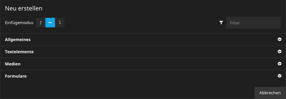 2. Im Anschluss öffnet sich ein Modalfenster, wo alle verfügbaren Inhaltselemente sichtbar sind. Die Inhaltselemente sind in vier Bereiche aufgeteilt.