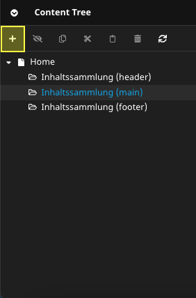 1. Im Bereich "Content Tree", den Reiter "Inhaltssammlung (main)" auswählen und auf das Plus-Symbol klicken, um ein neues Inhaltselement hinzuzufügen.