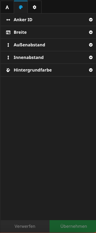 1. In den Tabs auf der rechten Seite befinden sich für jedes Inhaltselement die Standardeinstellungen. In den Standardeinstellungen können die Breite, Außenabstand, Innenabstand und Hintergrundfarbe definiert werden. Zusätzlich kann die Anker ID für die Anker Navigation eingetragen werden.